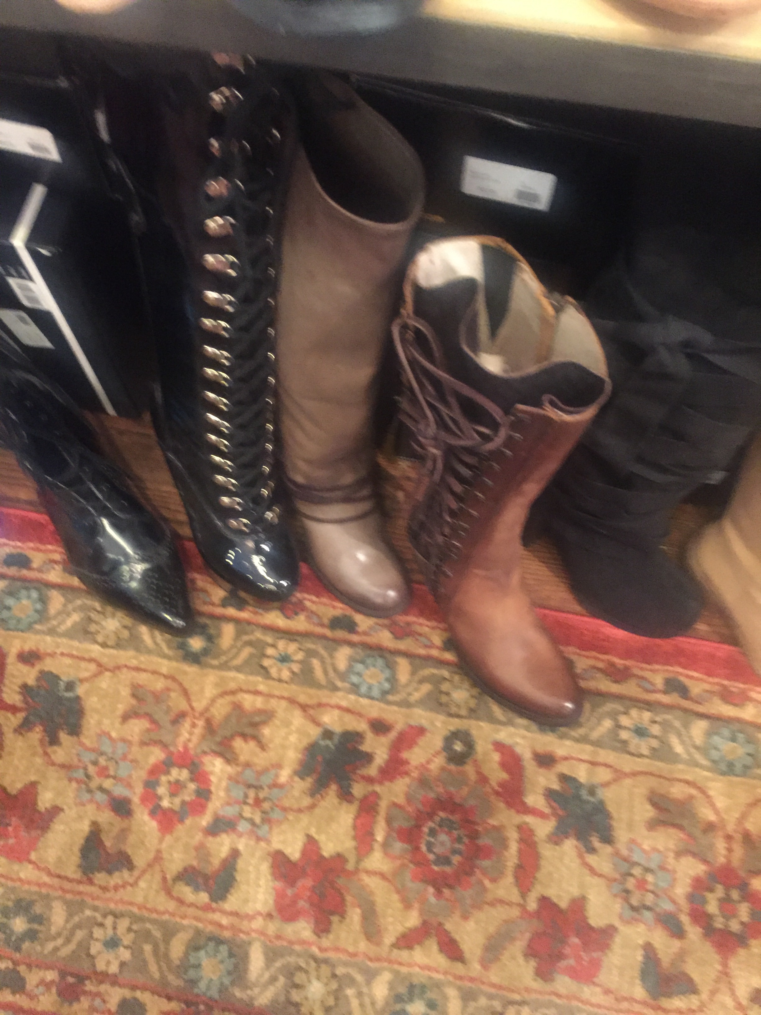 Fetish had some gorgeous clothes, jewelry, collars and lingerie. I fell in love with some brown cowboy boots with laces up the side. Functioning laces. As someone who wore cowboy boots for several years, they enticed me because of my attraction to cowboy-booty and my fascination of things that lace and tie.