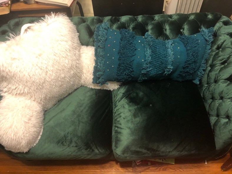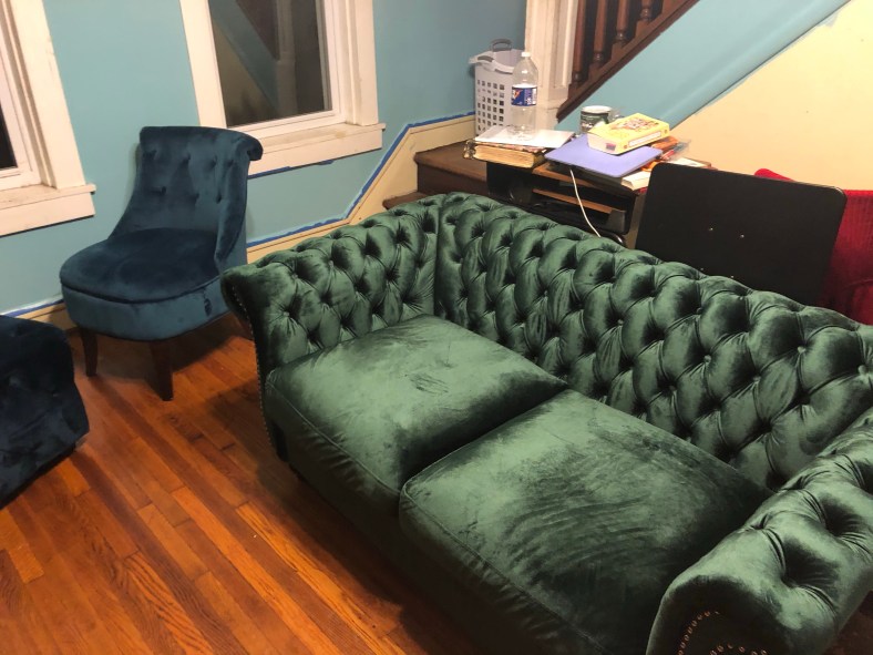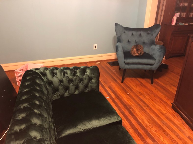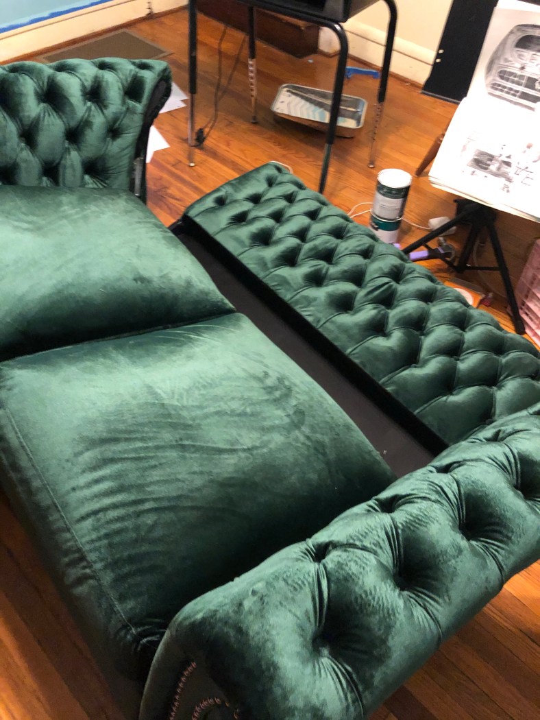 It’s an emerald green Chesterfield love seat. My daughter finds it obnoxious but I like bold touches.