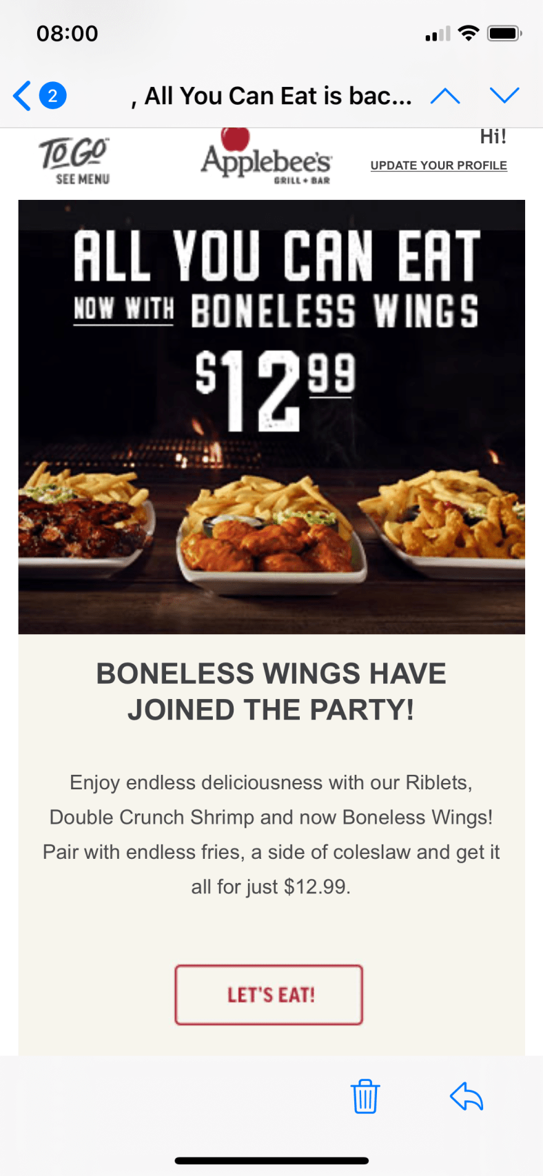 My weight though is up three pounds but I know that is because my only meal was at Applebee’s. I invited my dad and his wife to join the teenager and I at Applebee’s because I received this email: