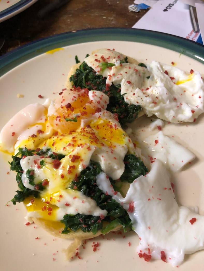 Last night’s dinner was homemade mozzarella that my neighbor received as a Christmas gift, spinach, a Pillsbury flaky buttermilk biscuit, two poached eggs and imitation bacon bits.