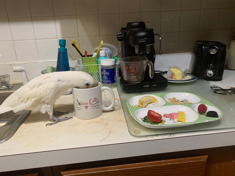 I think Nala thought my plate was her plate. So I ended up with a pretty pointed beak stab in the middle of my middle finger.