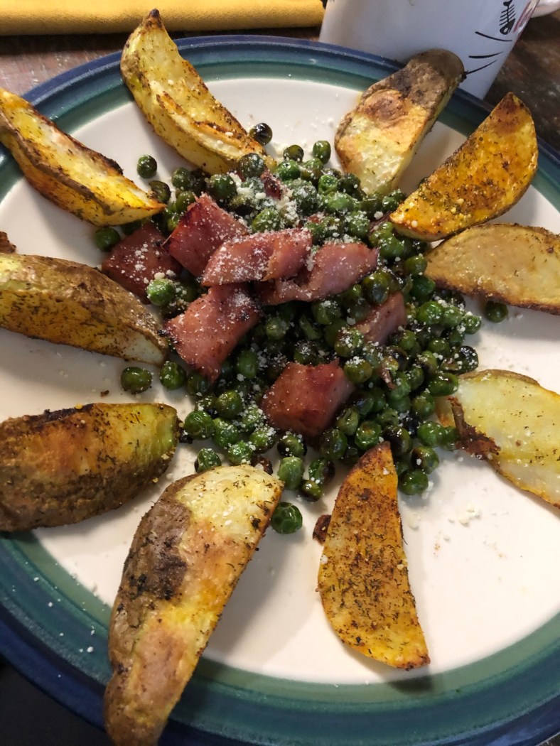 For supper I started with some potatoes getting very old, cut them into wedges and seasoned. I sautéed some leftover ham and some peas in a skillet, sprinkled it with some grated Parmesan and served plated to the best of my ability.