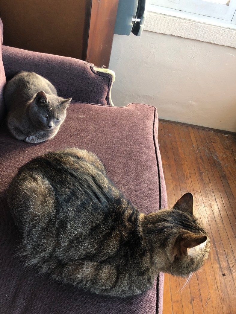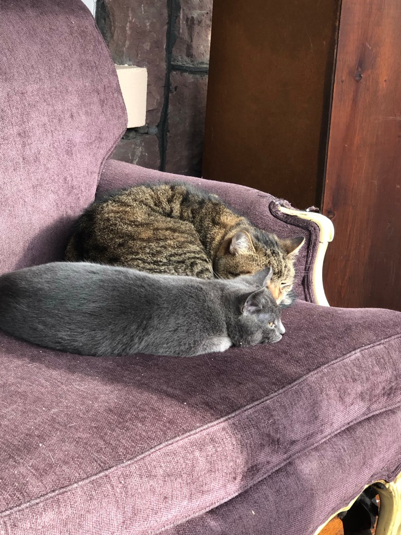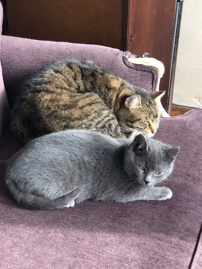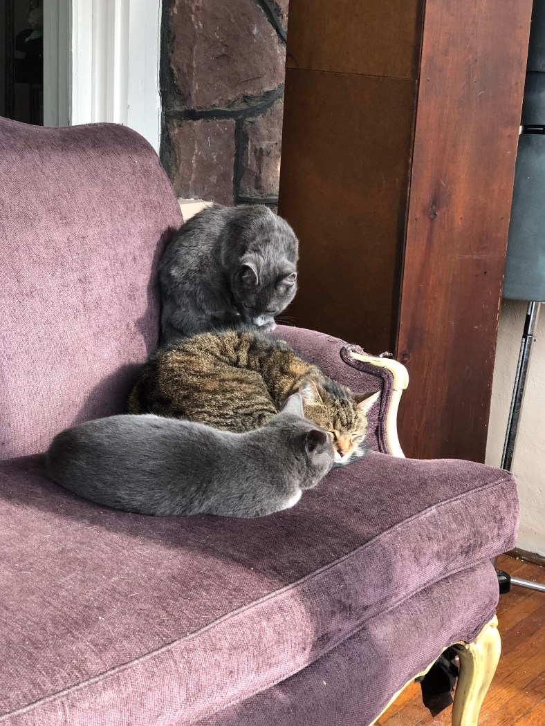 So the teenager is with her dad and I’ve been taken care of the kittens. Fog, the last trapped member of the brood, followed Opie out of the teenager’s room. Opie is our 9-year-old cancer survivor 3-legged cat.