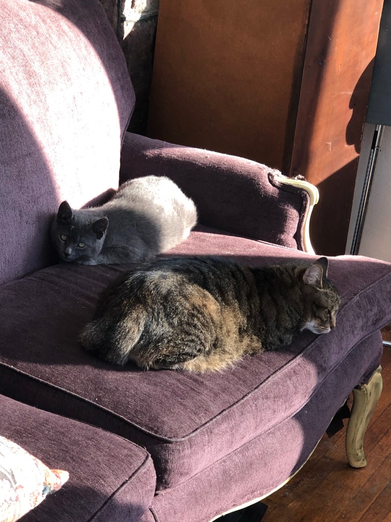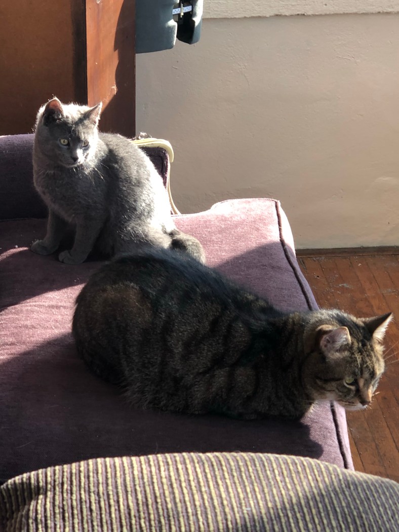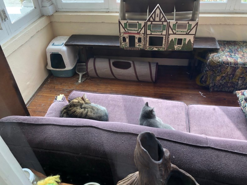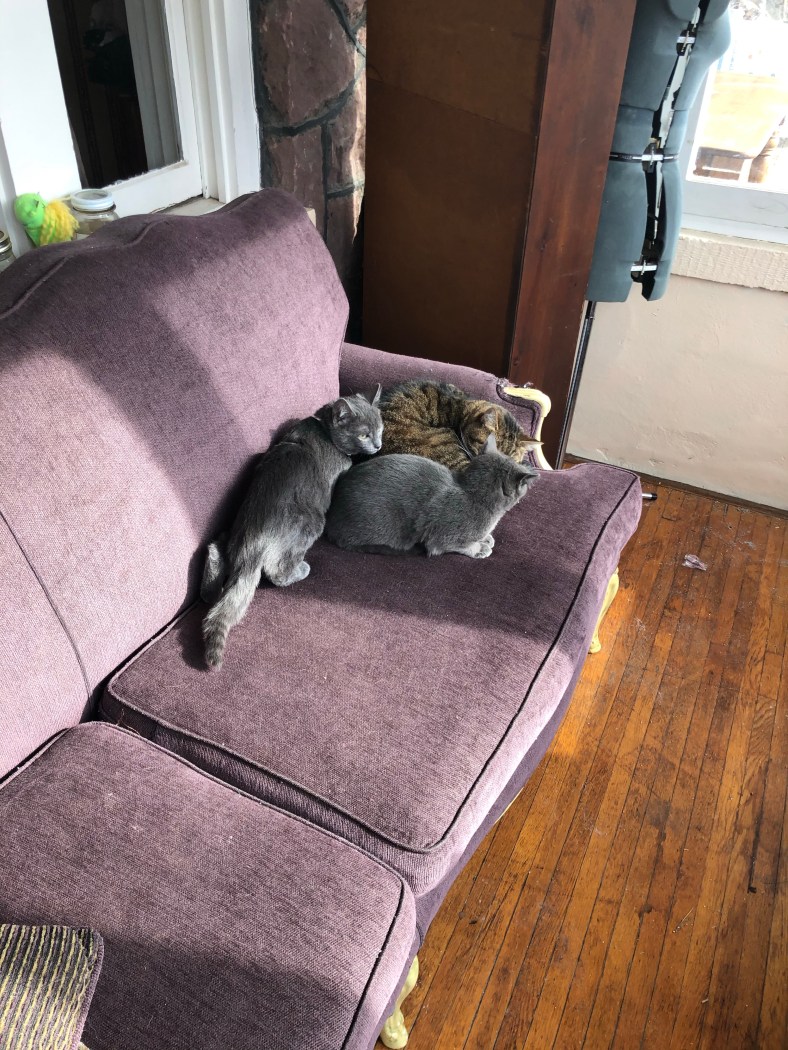 So the teenager is with her dad and I’ve been taken care of the kittens. Fog, the last trapped member of the brood, followed Opie out of the teenager’s room. Opie is our 9-year-old cancer survivor 3-legged cat.