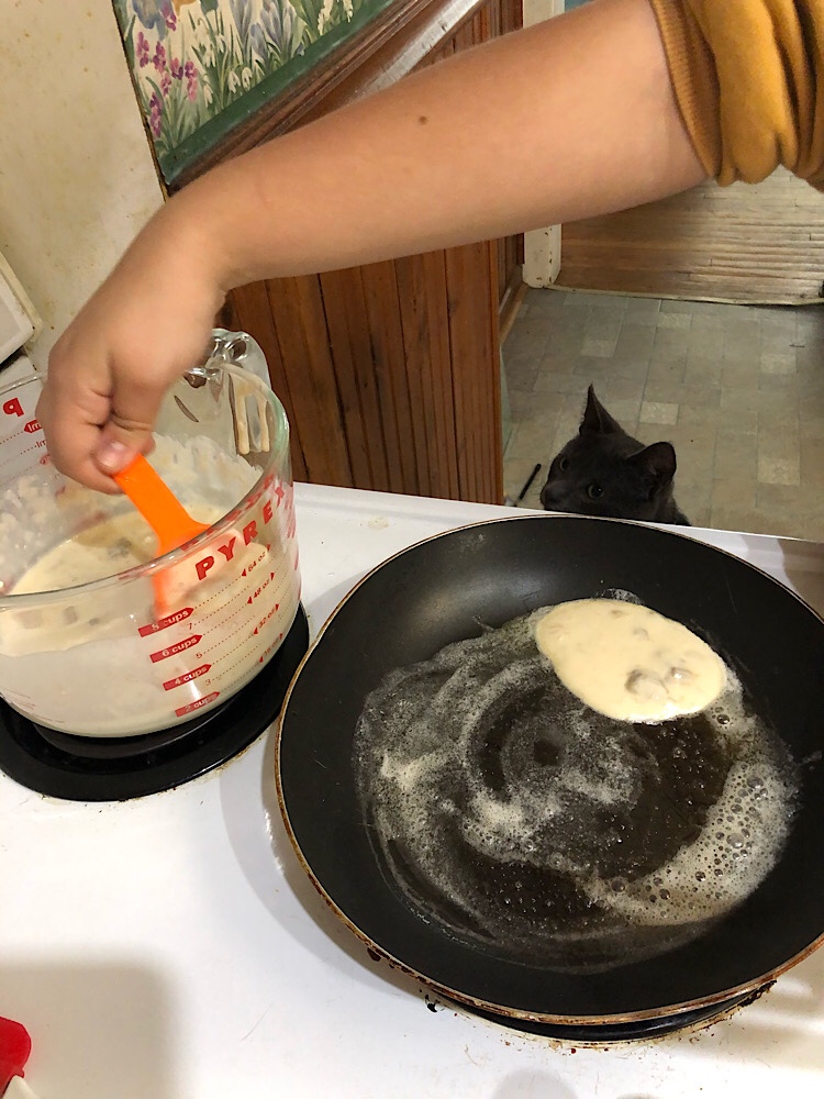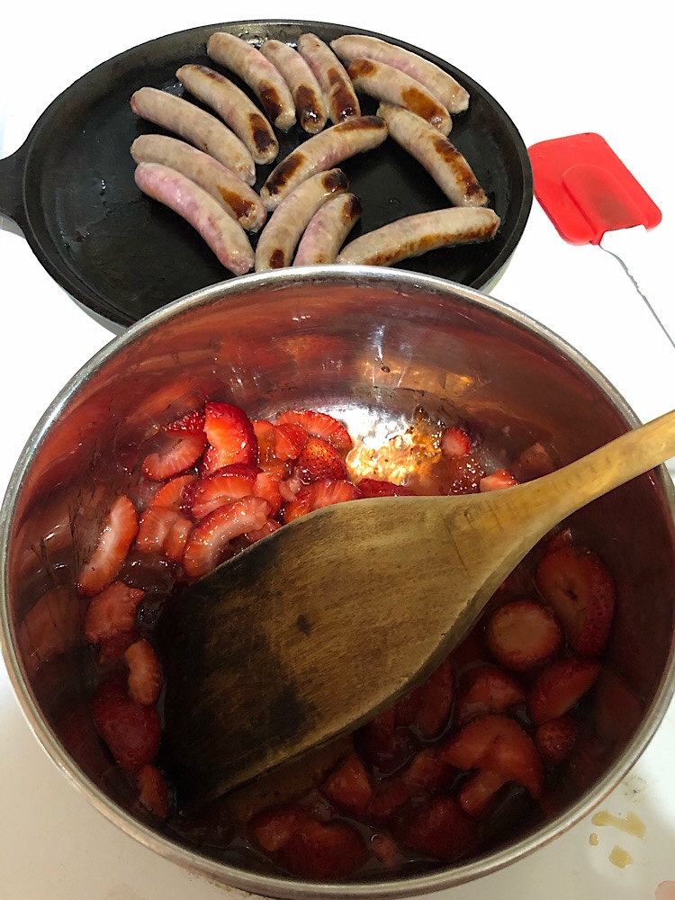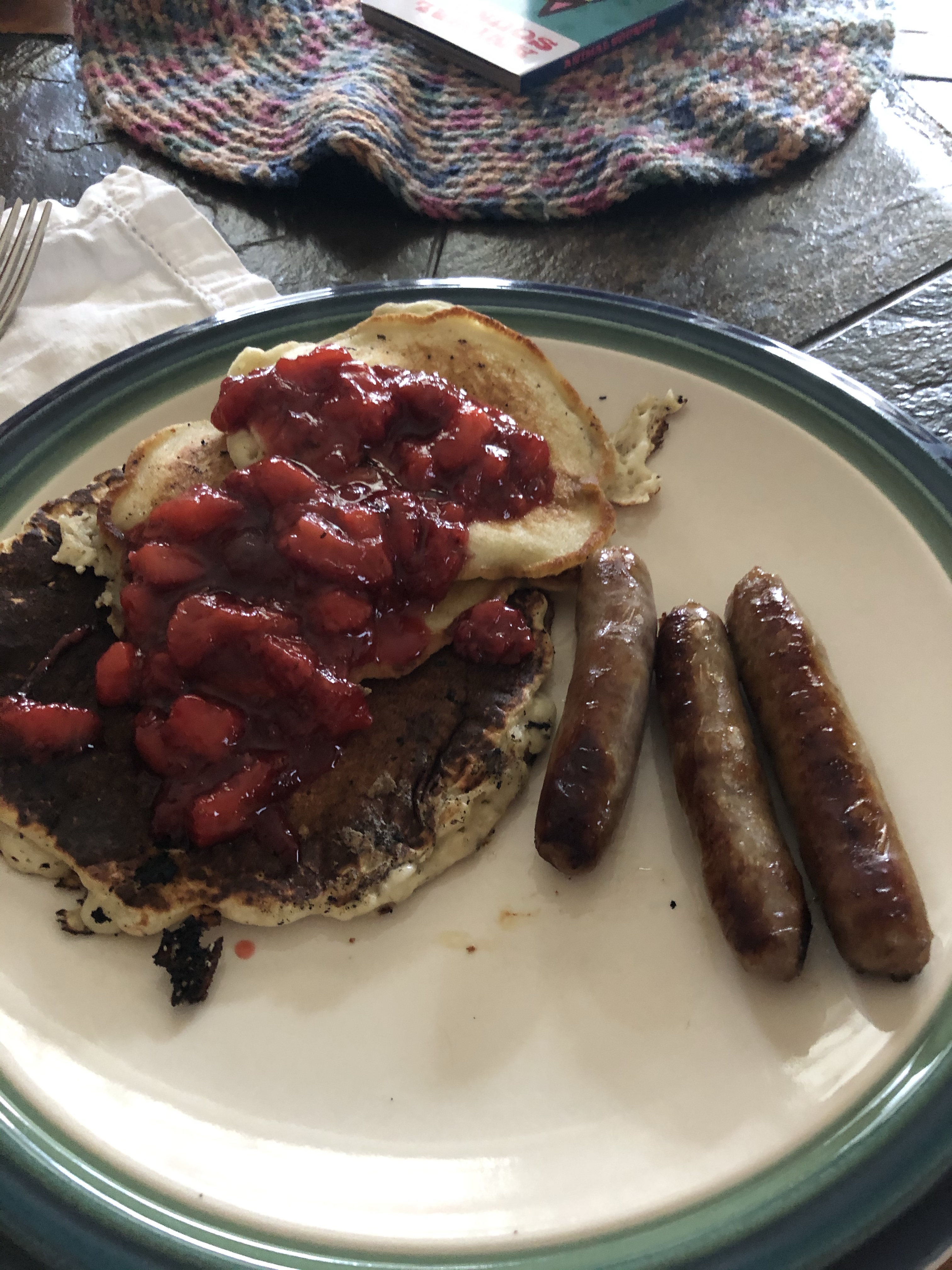 Today the teen and I made brunch. She made banana pancakes and I made maple sausages and hot strawberry sauce made with organic strawberries.