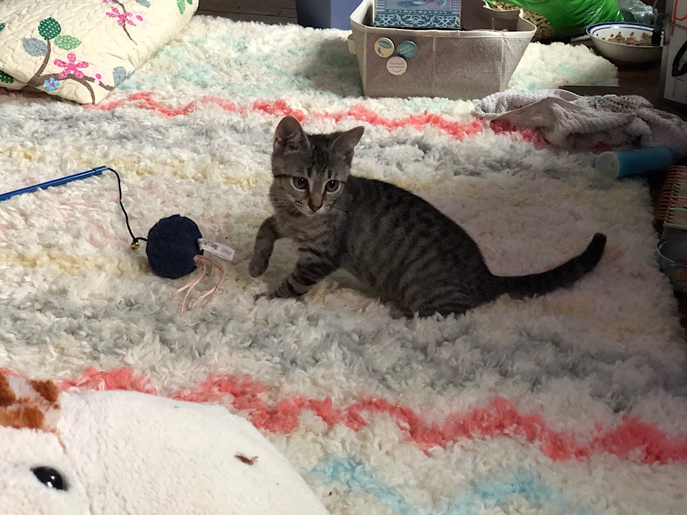 We named him Zeus. Zeus likes to eat and likes to play. Artemis plays a little, but Zeus really likes to play.