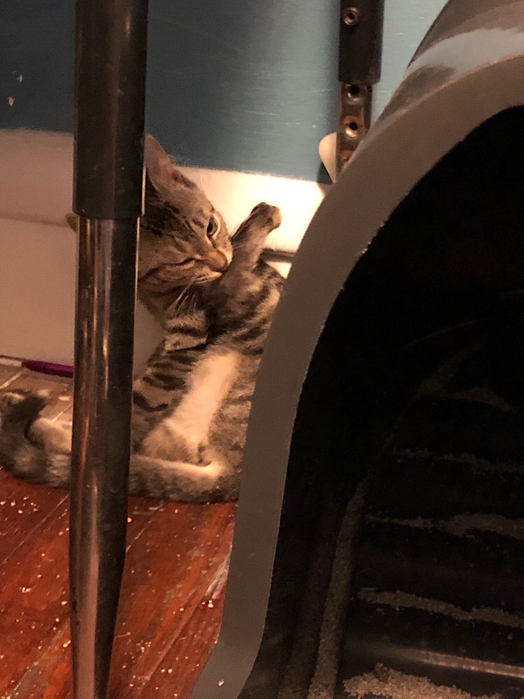 Artemis and Zeus are the two kittens in the foreground in that video. Artemis loves to be nearby. He and Zeus are always the first to the food bowl. Artemis has also worked up the nerve to start exploring the rest of our house. And he’s so fuzzy.