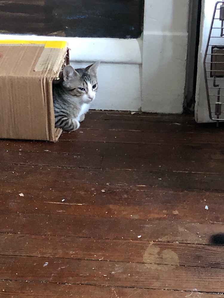 Now, Hermes has the cutest white bib and patches on his face. He’s timid, but curious. He will sit and watch you and then start bolting around the room, hence naming him after a messenger with wings on his shoes. We have not 100% confirmed his gender.