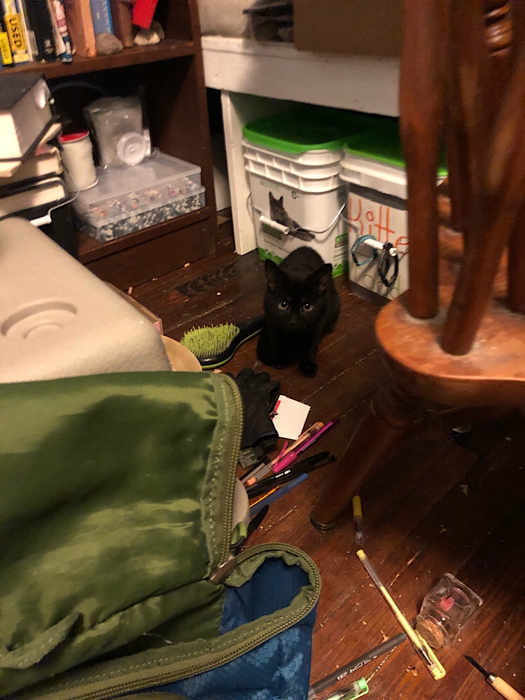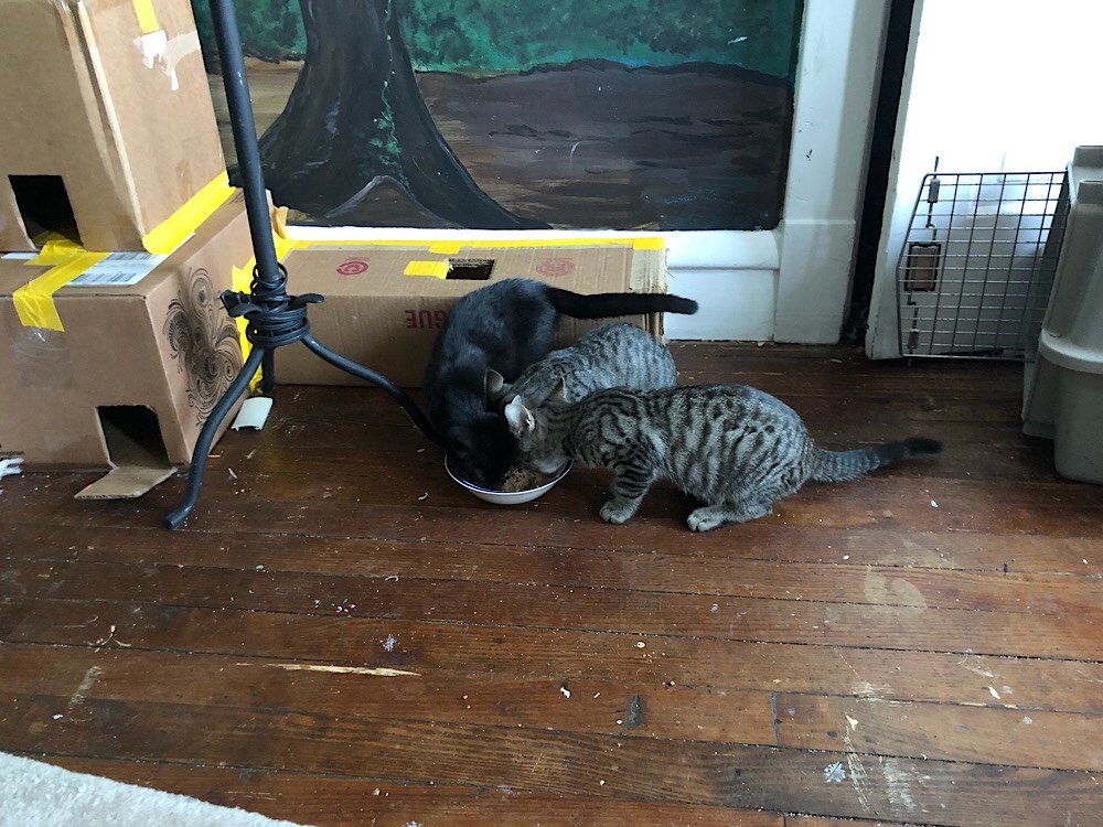Hades is solid black and looks the most fuzzy of all of them. She has huge golden eyes. Earlier this week, we started pushing single serve portions of wet cat food (laced with antibiotics) into her favorite hiding spot and a few days later, she started slowly joining the rest of the litter.