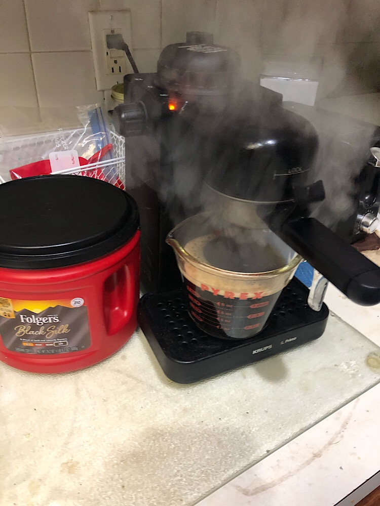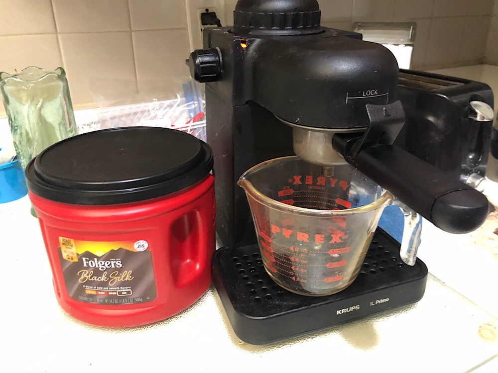 5. Instead, I consume my caffeine via the espresso machine. My first real boss— my first white collar, grown up job—gave me a $50 Boscov’s gift card when I got married. At the time, I thought that was ridiculously extravagant of him. I did not start drinking coffee regularly until after the teenager was born. To do justice to the generous gift from my boss, who was a coffee drinker, I purchased a tiny espresso machine (with steamer) and coffee grinder. I thought I had arrived in the world. I use this to make my coffee. Yes, I am putting commercial Folgers into my espresso machine.