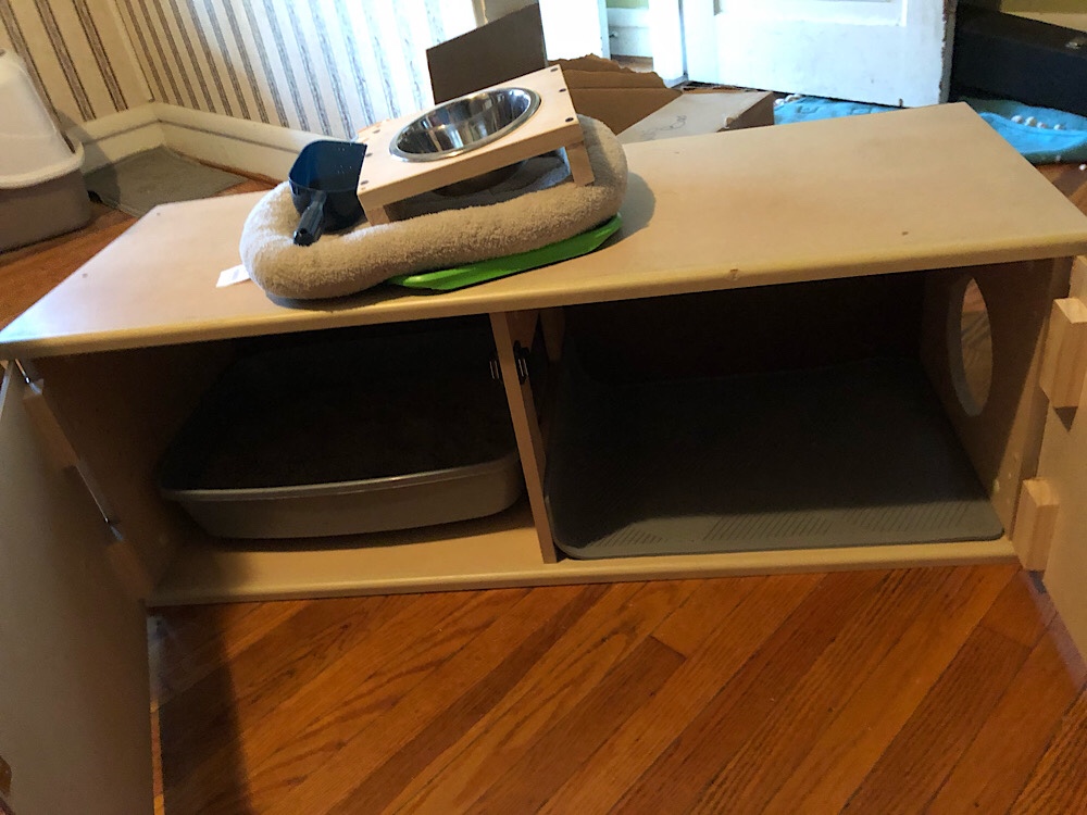 What does your Monday look like? Did it look like mine? The teenager finished painting the custom litter box she and her uncle made yesterday from my neighbor’s old TV shelf.