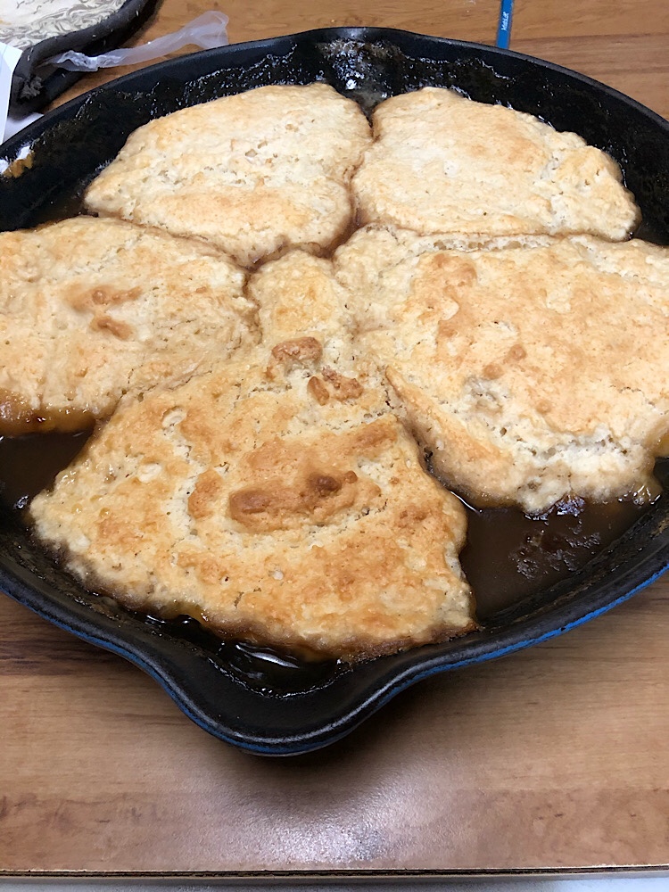 In a large glass baking dish (or I used my Le Creuset skillet), place brown sugar and flour from the syrup ingredients in the bottom. Add the water.