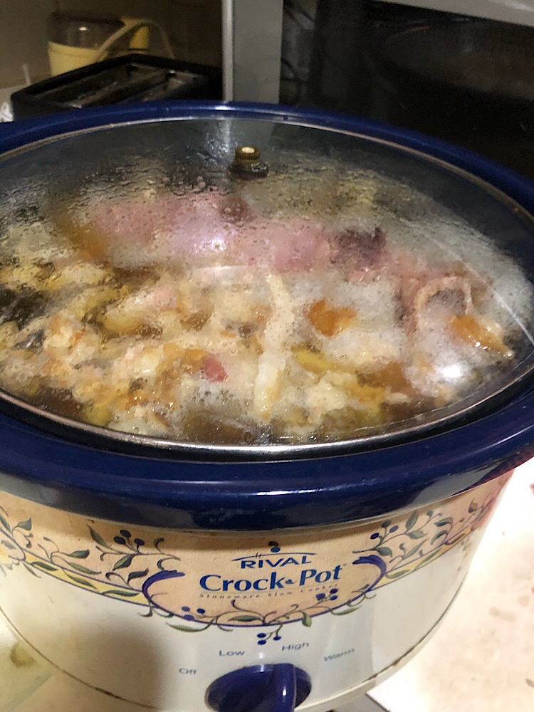 • I put the ham bone, all the fat, and some smoked pork neck bones in the crock pot to make stock for ham and black bean soup.