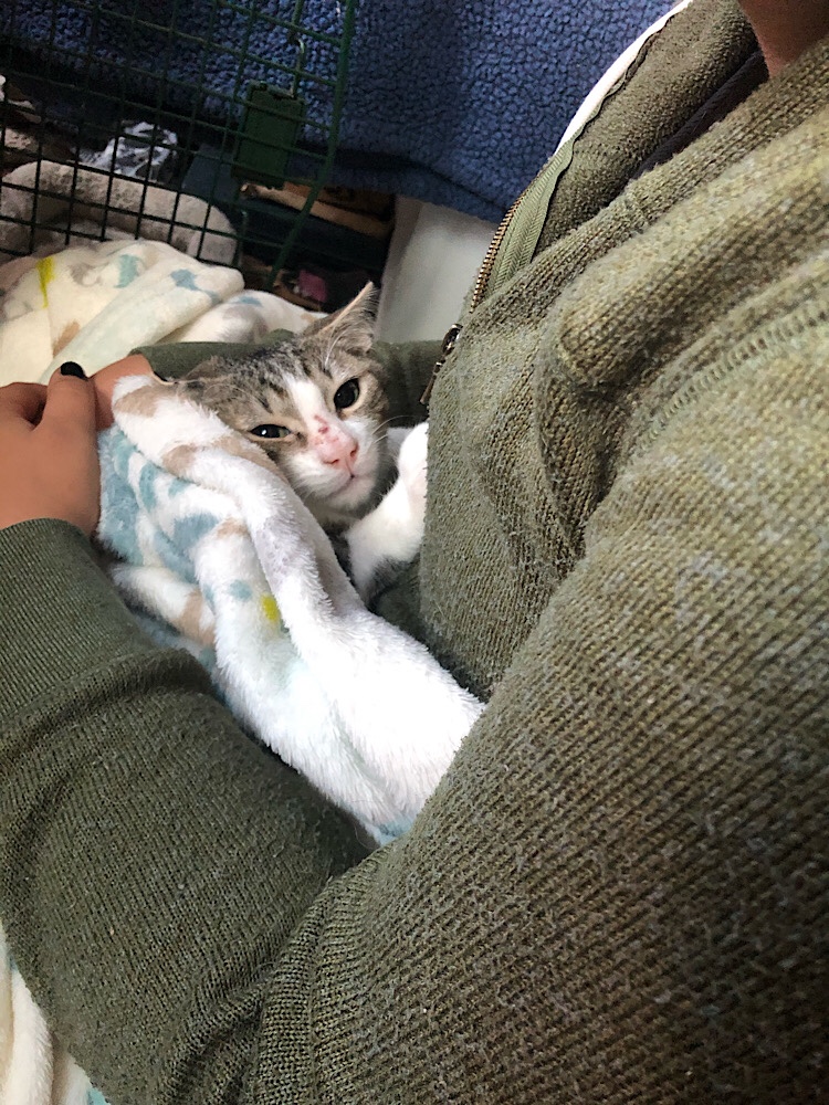And we’re working on teaching Hermes to cuddle. He’s been the sickest of this group so poor guy has spent most of his life getting scruffed and having medicine applied: first antibiotics and eye cream, then ringworm cream on muzzle and belly.
