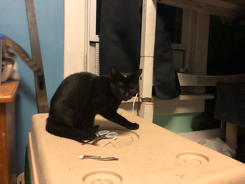 Hades, the little black cat who bit me and sent me to the hospital, is inquisitive but hides most of the time. She now has caught ringworm from her brother Hermes, so we crated her.