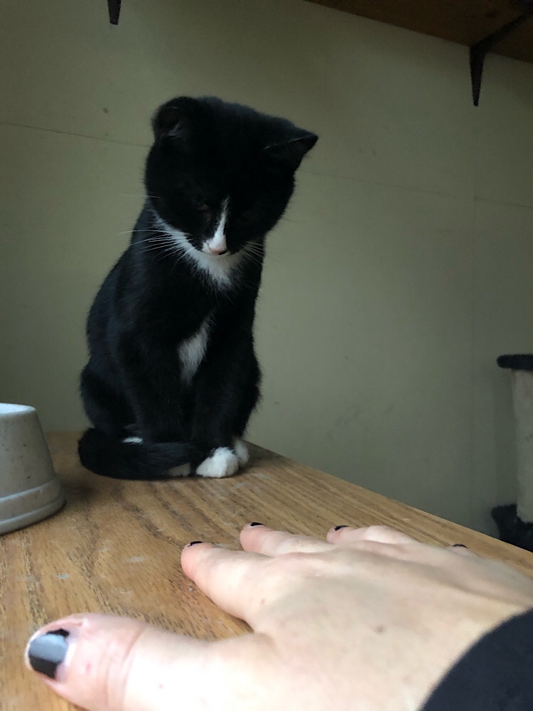 Vesta— Vesta is very timid and she often comes to the food bowl and then runs back to the corner feeling exposed and unsafe and then comes back. She has a beautiful stripe on her face. Very narrow.