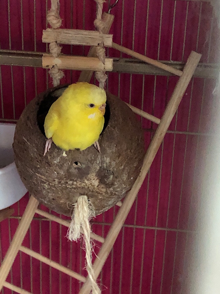 So I set up the small parakeet cage and wanted to separate Boo from the family. But she wouldn’t cooperate. They were all fighting so badly I was able to take the coconut shell of babies.
