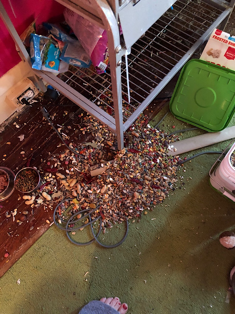 I dropped Nala’s food bucket and spilled a pile of cockatoo/parrot food. As any of you that has a bird feeder may realize, bird food is not cheap. Imagine having a large bird that tends to discard more of her dish than she eats…