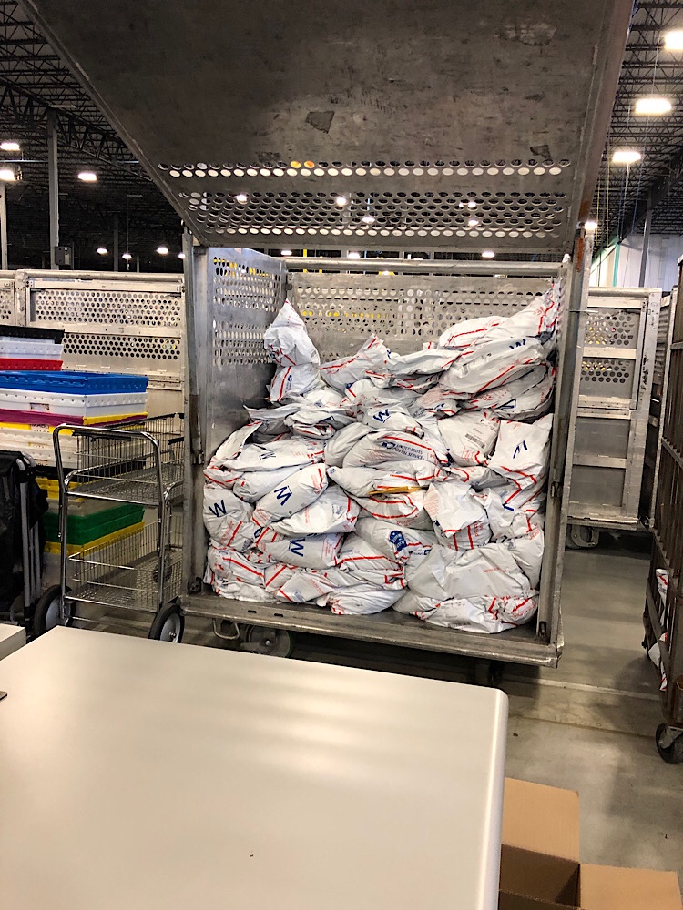 This was my work today. When I started this was full to the tippy top— so I opened and processed all that mail and got about 300 pieces of clothing back onto the warehouse floor.
