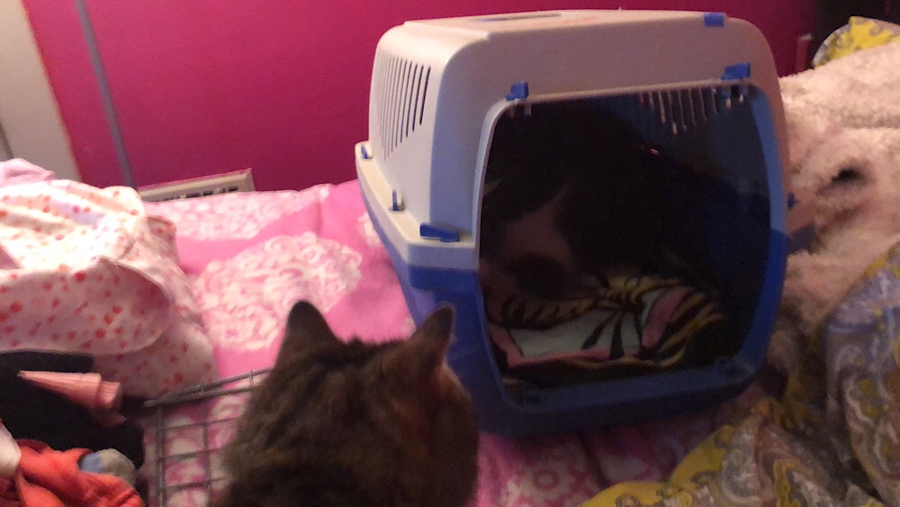 I allowed Opie to be in my room when we opened her crate hoping that seeing another three-legged cat might give her some self-confidence. It certainly might if she ever sees Opie stand up to our 50-pound puppy.