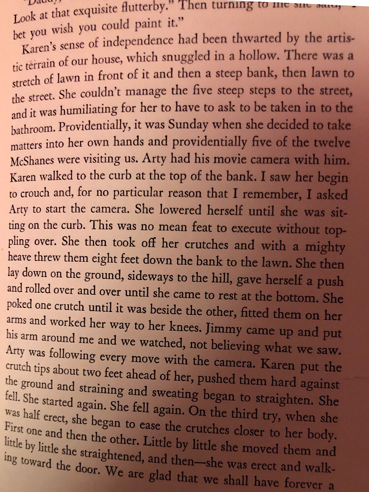 In the passage photographed above, Karen tries to navigate a hill. Mrs. Killilea never quiet explains where she was going— to the house? Away from it? Karen throws her crutches down the hill, rolls, retrieves her crutches, falls several times trying to get up, while her family watches and records it on a neighbor’s home movie camera.