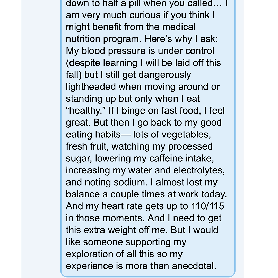 I sent a message to my doctor yesterday asking if I could go through the medical nutrition program– and he referred me. I’ll be going Monday.