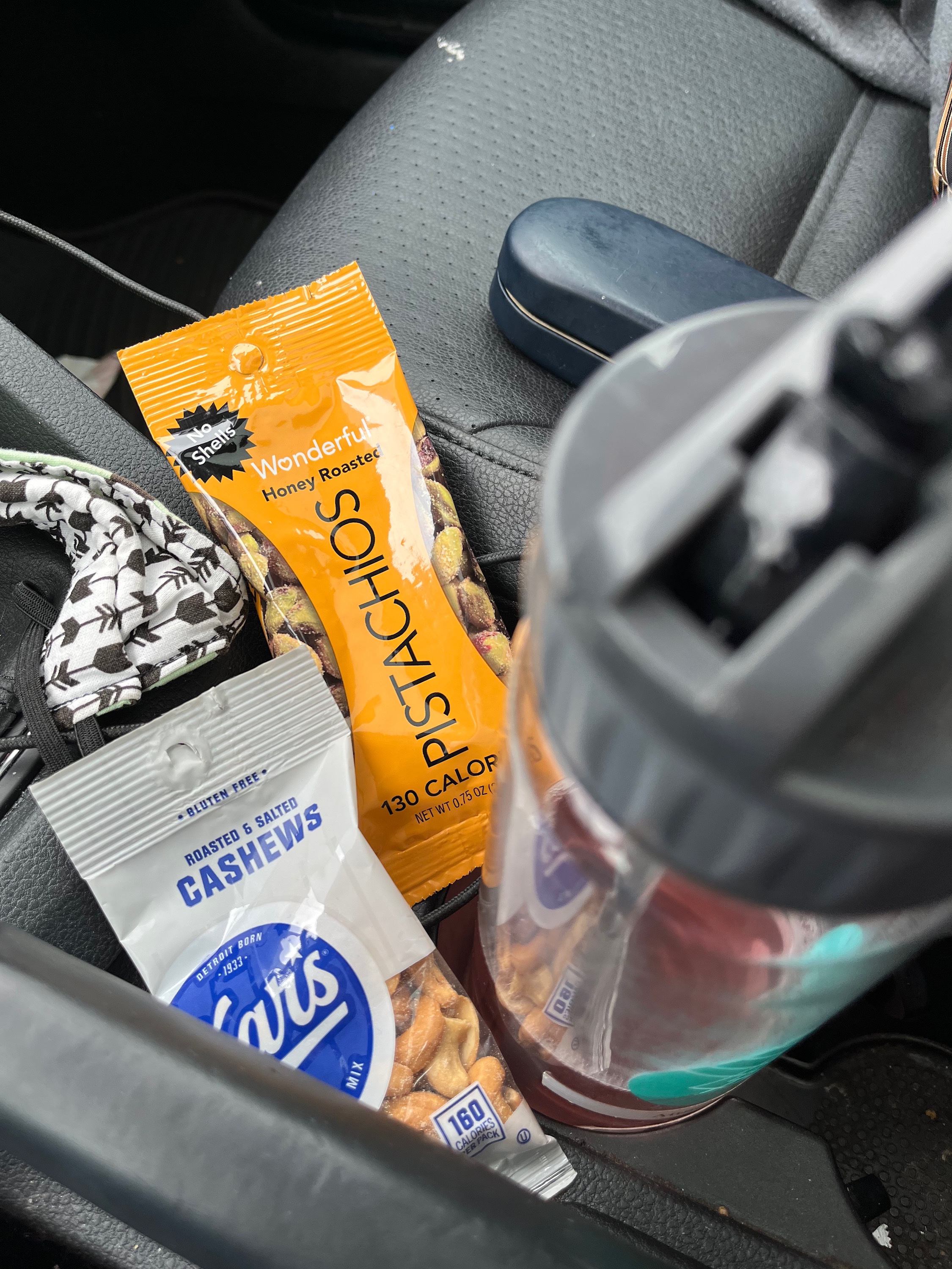 - 4 p.m.: about 12 ounces electrolyte water with a hint of cucumber and honey roasted pistachios.
