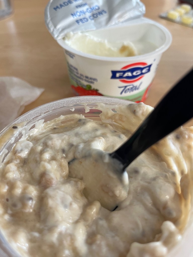 - 8:30 a.m.: about 24 ounces in on water intake for the day. Brekki overnight oats, which were sweet, syrupy and wet so I added plain Greek yogurt.