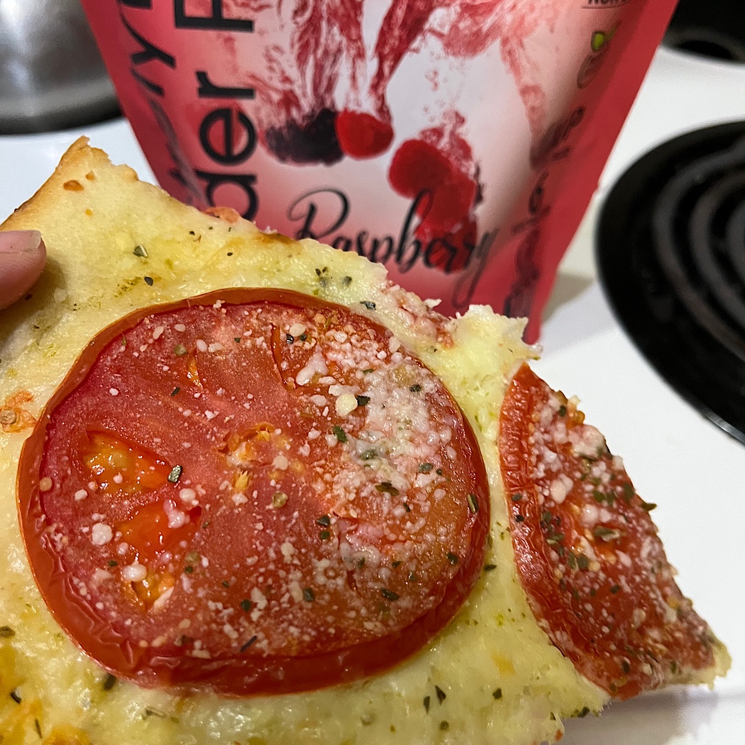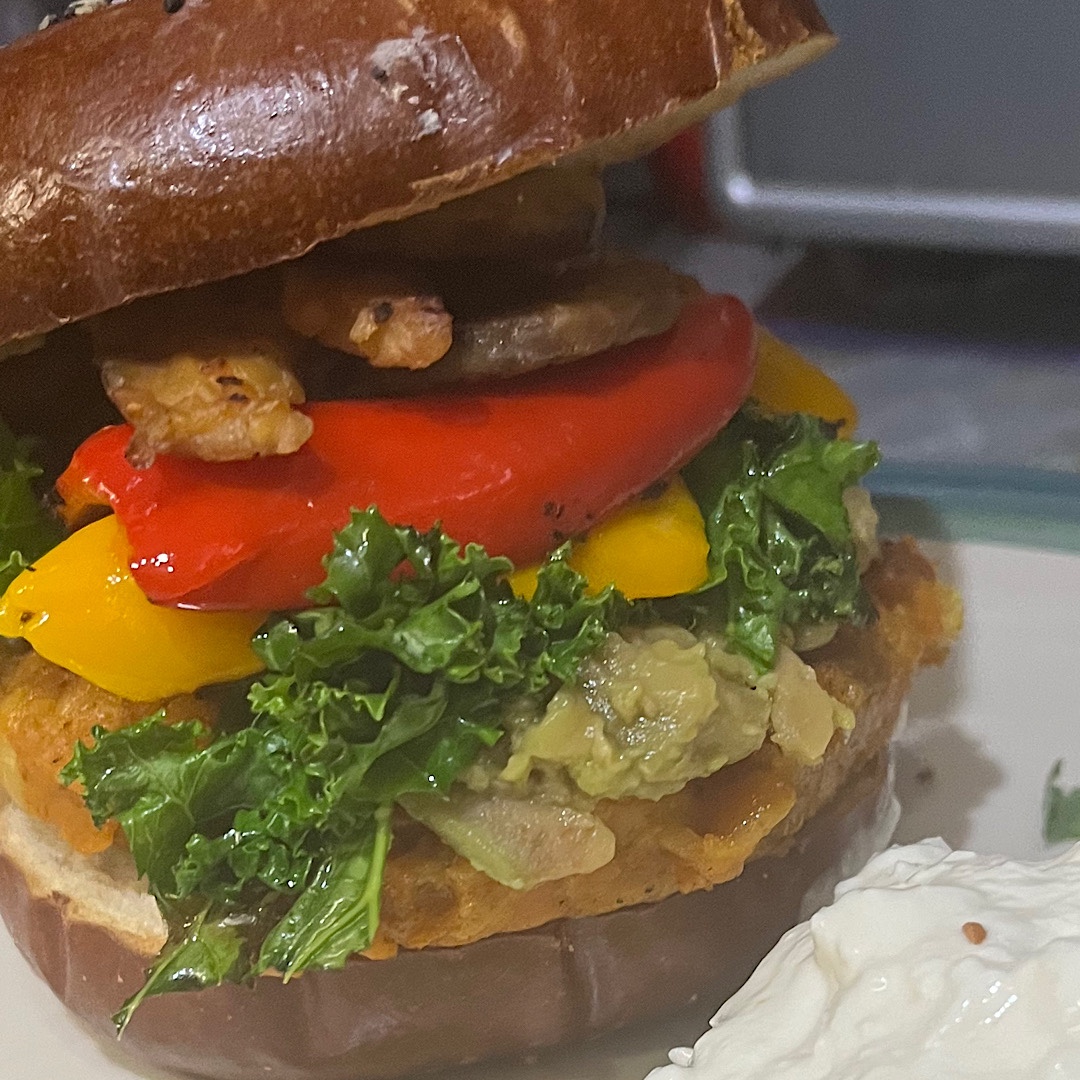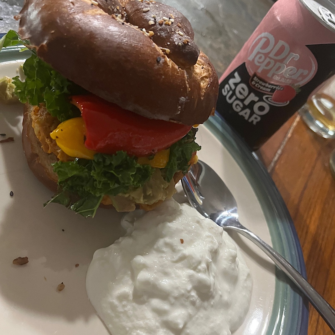 - 4:30 p.m.: dinner based on a recipe from Hungryroot–“the actual orange burger” made from sweet potato, carrot and red pepper topped with avocado, sautéed kale and yellow and red peppers (and I probably used too much oil), BBQ tempeh, and nutritional yeast and served on a pretzel bun toasted in the oven after a brush with margarine and everything bagel seasoning. Served with cottage cheese, because honestly I’m concerned it might not have enough protein and a Dr Pepper Zero Strawberries and cream.