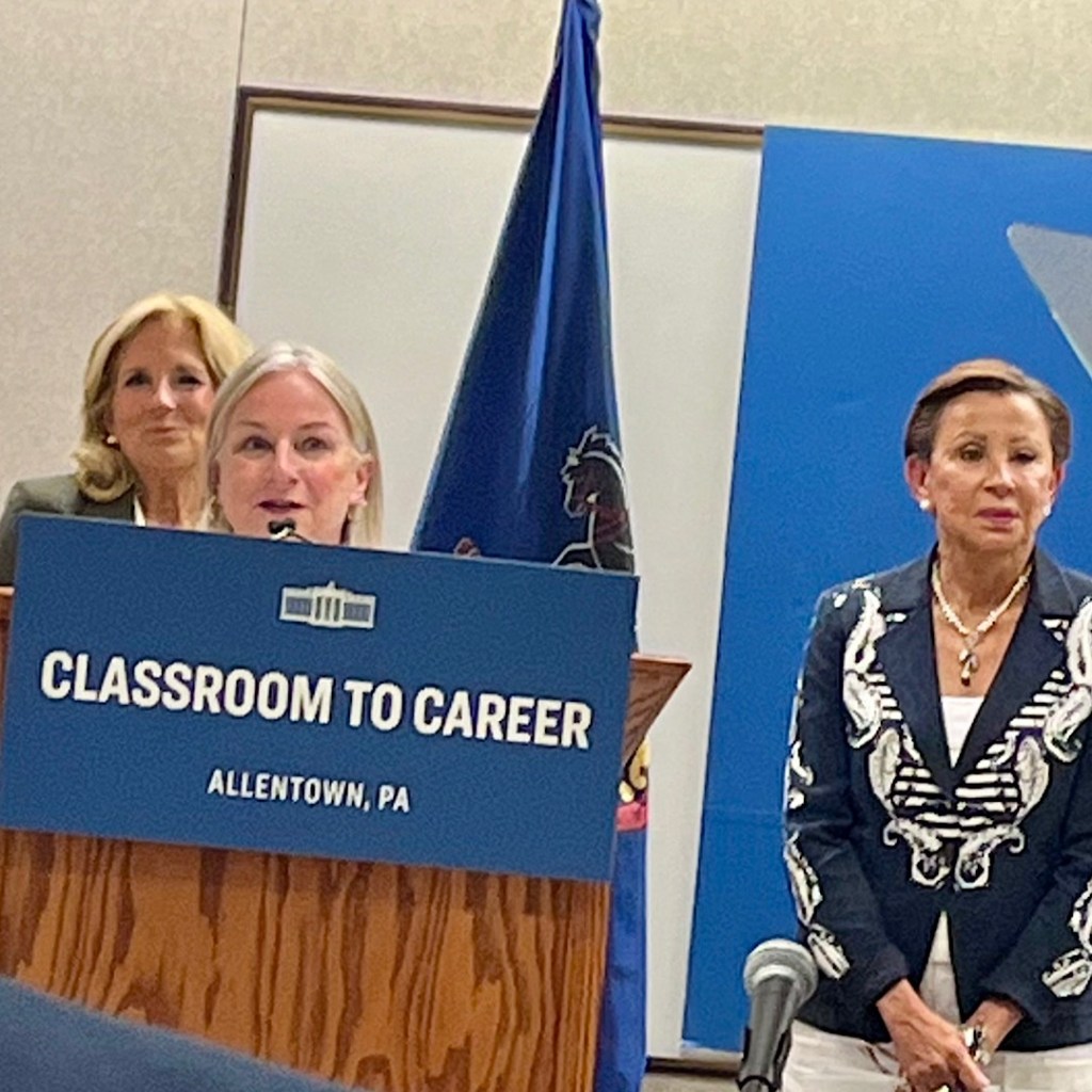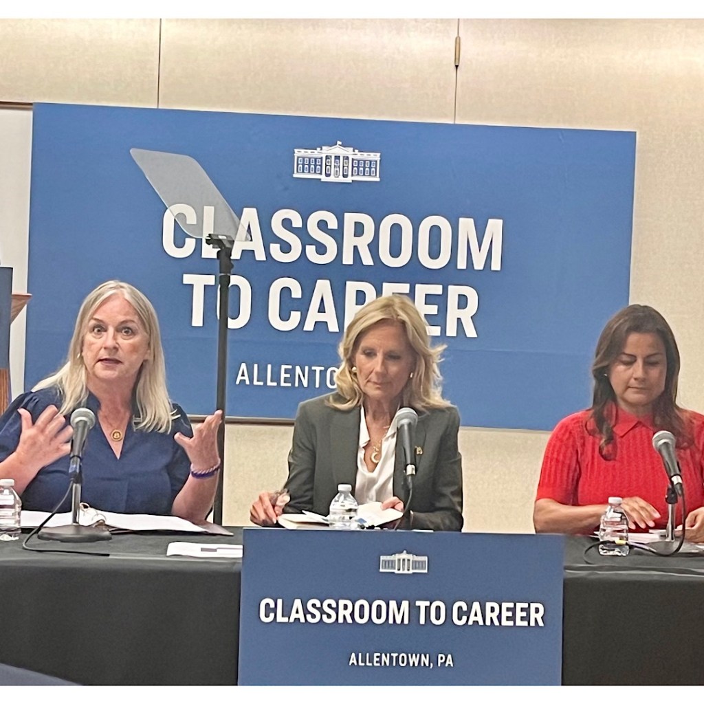 Anyway, Allentown’s population is 50% Latin, so lawmakers like to stop by to woo the Latin voter. Yesterday, Jill Biden visited Lehigh Carbon Community College to promote Career to Classroom, a proposal from the Biden administration to “reimagine high school” by connecting students to jobs, training and opportunities to learn skills and an associate’s degree while still in high school.