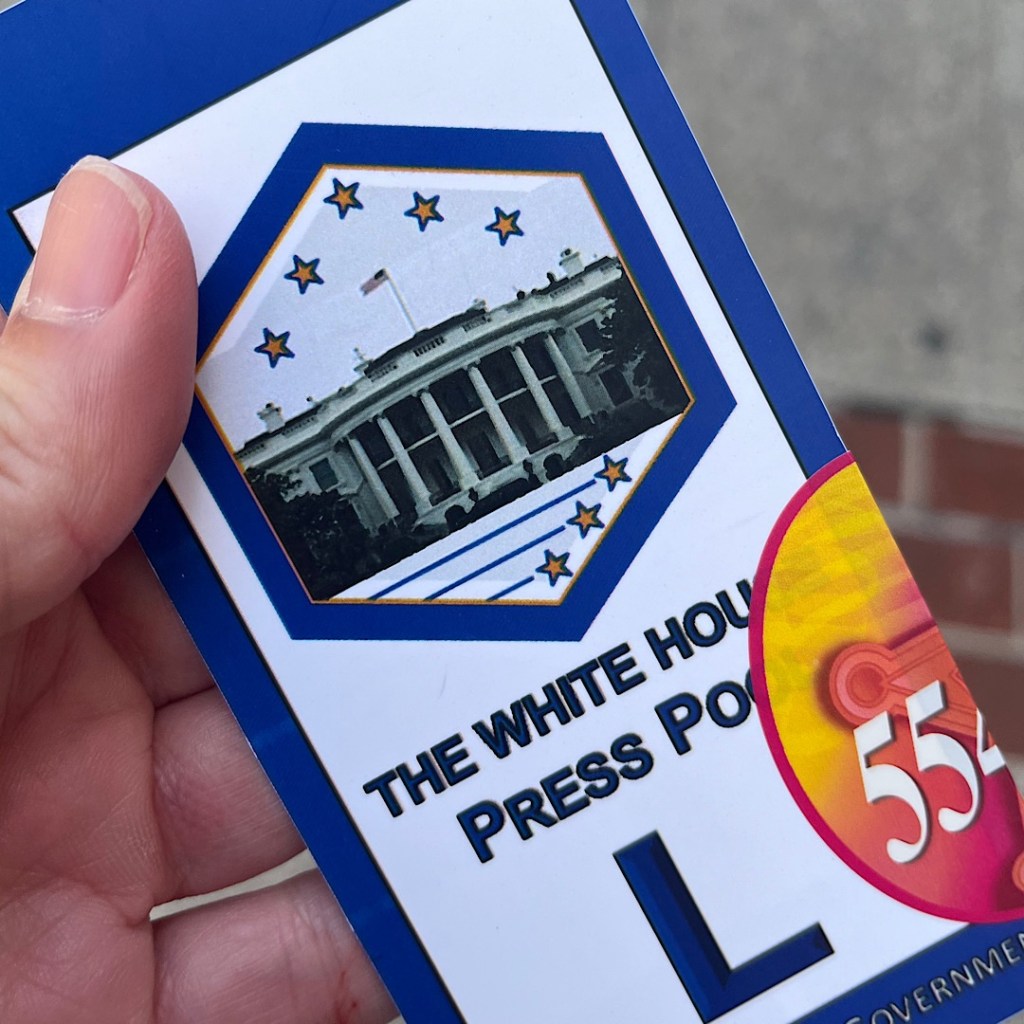 I headed into the elevator and up to the third floor. As we arrived, I saw the sign for the restroom. So, I asked the Secret Service agent if I could go to the restroom. I was told yes. When I returned, I entered the room and saw a random sign for “media entrance.” I saw all the video news crews and photographers setting up their tripods. To stay out of the way, I wove farther into the room and sat down.