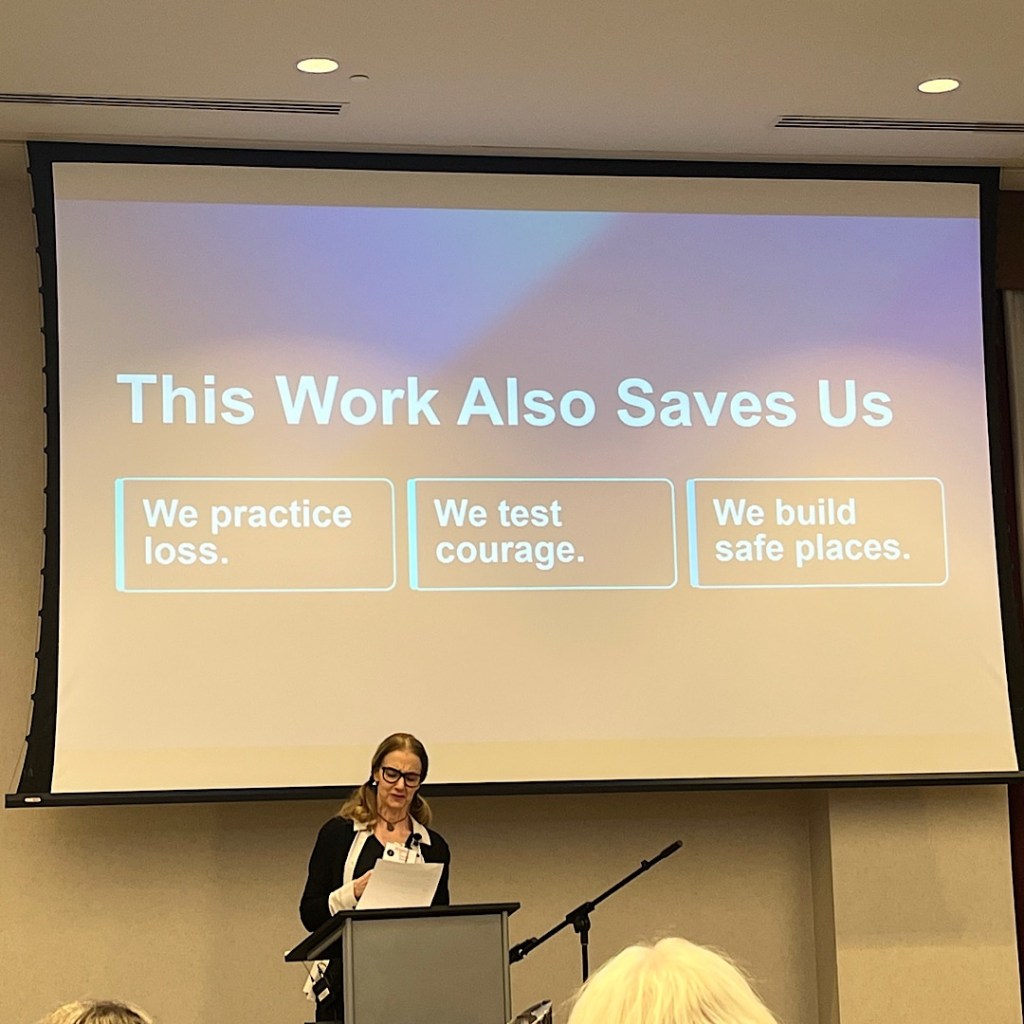 After two morning sessions, we returned to the main ballroom for a lunch of salmon or filet mignon while Kristin presented a keynote celebrating the lifesaving powers of the maker-uppers. Gayle Hendricks attended the event as Parisian Phoenix author Larry Sceurman recently had a knee replaced and could not use his seat. She found the sessions on creative non-fiction relatable to both her life experience and her career as a graphic designer.