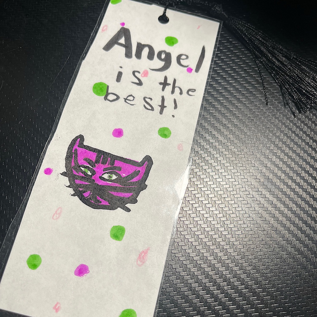 It was also our first time using our new tablecloth, which looked very pink, in the best way possible. And our new friend and author Sheena Stimpfl stopped by with her daughter to present me with a special gift– a custom bookmark.