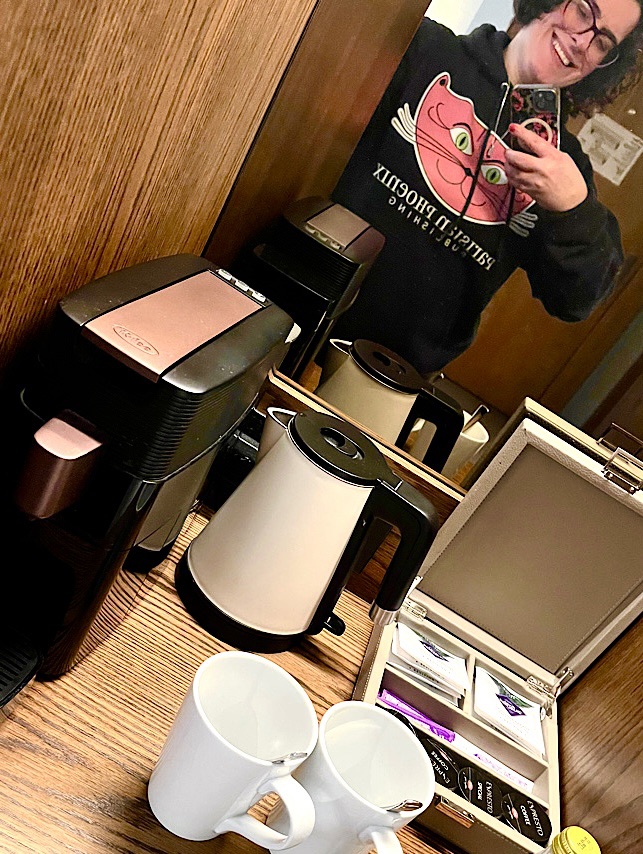 We are staying in the Hyatt Centric, The Liberties, Dublin. My room has a pod-fed espresso machine, an electric tea kettle, a selection of teas, unrefrigerated milk in a glass jar, and a bottle opener. I wondered if I needed it for something– the bottle opener– but then I realized: