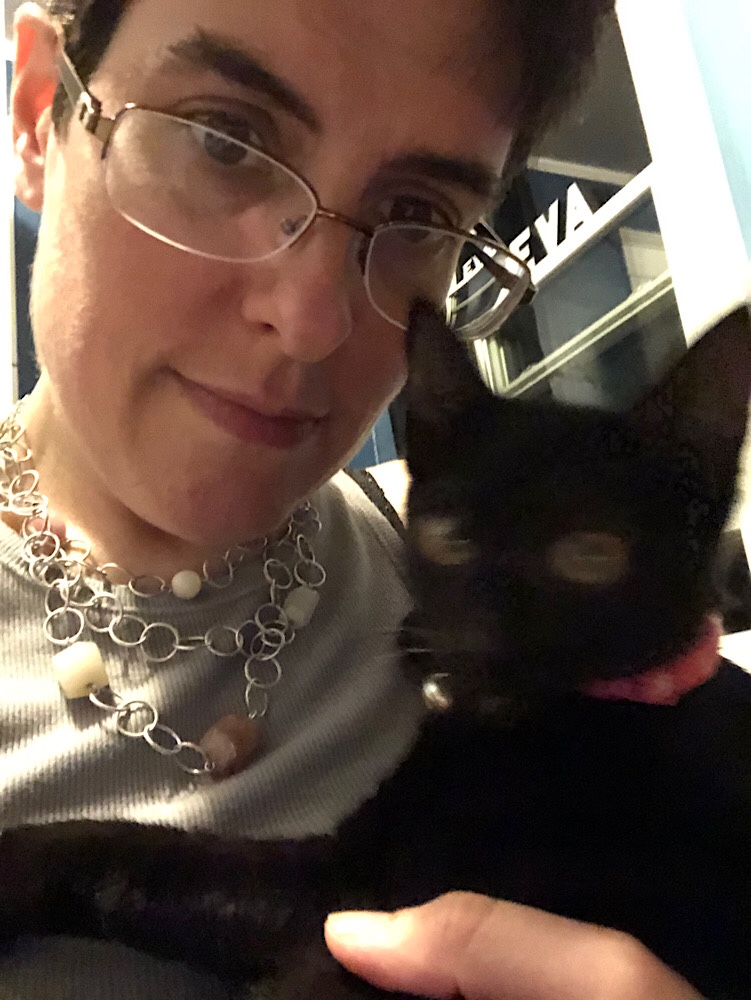 Meanwhile a litter of kittens came in very feral except for this very mellow black female with riveting brown eyes and an angular face like an Egyptian princess.