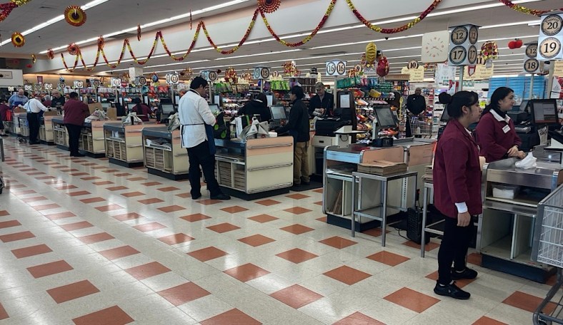 Then, we hit the food court. I wish we had a paper menu I could share with you. Eva had a saucy cheese street dish (Pav Bhaji) with toasted rolls, a mango lassi, a fruit drink AND a cup of hot masala chai. I had the cauliflower (Gobi Manchurian) and a odd little cookie coated with saffron (Kesar Vati).