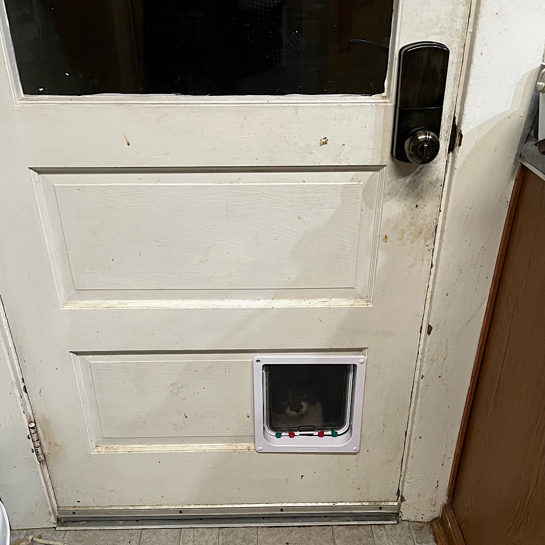 She even put a cat door leading from the porch to the kitchen so the cats have access 24/7. Touch of Grey, our foster with a hysterical and sometimes volatile personality, has made the back porch/mud room her new domain.