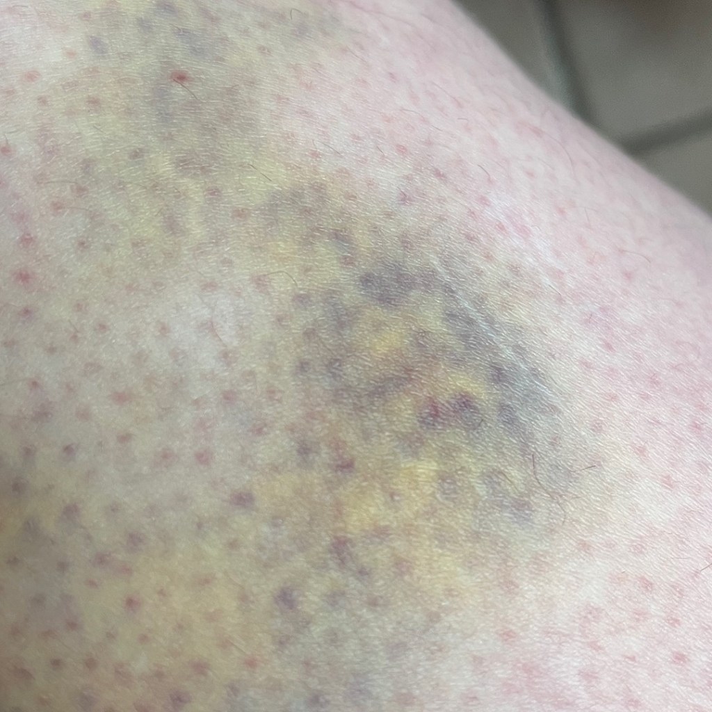 The finger is looking and feeling much better. Discoloration and swelling has greatly reduced. The bruises on my leg look worse than and feel worse than my finger.