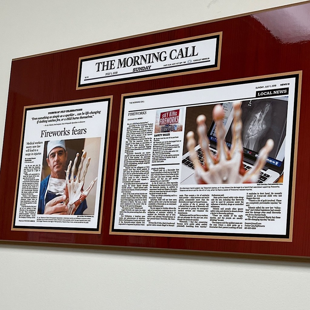 I saw a new doctor today. While waiting in one of the exam rooms at OAA– the same practice that treated my mallet finger last spring– I noticed a framed newspaper article on the wall by someone I know. So I texted her. We had a brief exchange and that was a wonderful reminder of how small the Lehigh Valley can be.