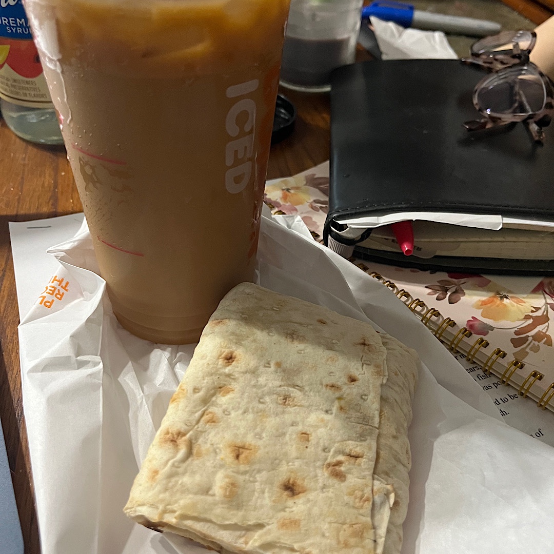 8 p.m. last night: about 15 ounces water that kept me up peeing until almost 1 a.m. 6:30 a.m.: tried to brew 26 ounces of Supercoffee with about 1 tablespoon of cacao with maca powder. Think I brewed the coffee super strong. Served with half and half 8:15 a.m. poured second cup of coffee, realized I hadn’t had any water yet, poured 12 ounces. 9 a.m. ordered an iced tea for my daughter and “had to try” the new 200 calorie coconut macaroon iced coffee at dunking (but I got decaf) and the new chicken and roasted pepper wrap. 9:15 another 8 ounces of water; dunkin arrives, coffee made with coconut milk. It’s too sweet it’s going in the fridge. 12:20 15 ounces unsweetened earl grey iced tea 3 p.m. trying to drink the decaf coffee from dunkin (finished it)– two everything bagel tortilla, avocado, roasted pepper and kale, vegan meat slices and nutritional yeast.