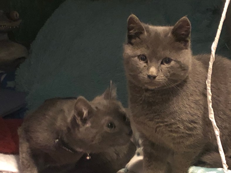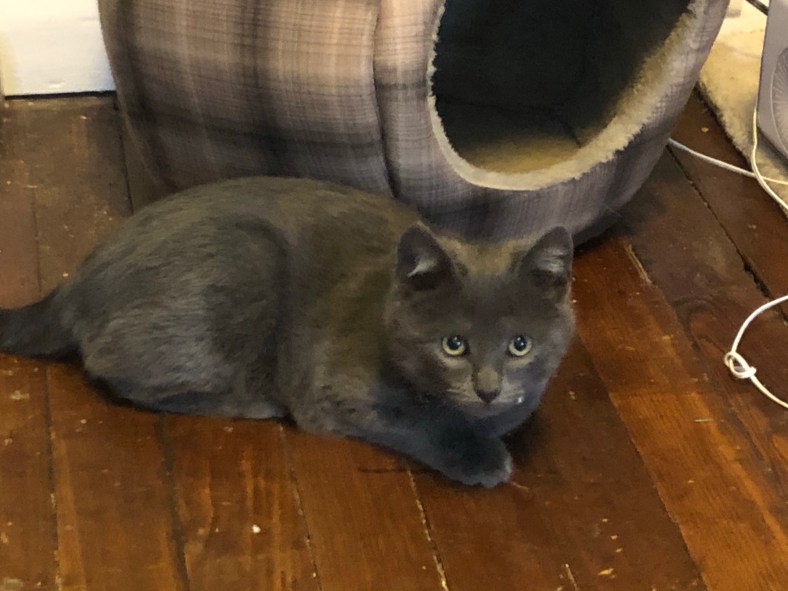 So the teenager is with her dad and I’ve been taken care of the kittens. Fog, the last trapped member of the brood, followed Opie out of the teenager’s room. Opie is our 9-year-old cancer survivor 3-legged cat.