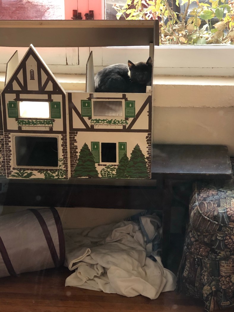 Nala pooped on me right away, and all I had on was a t-shirt and underpants. We went to make coffee, feed the cats, and I made her tea. She pooped on me again. Time for a clean t-shirt.
