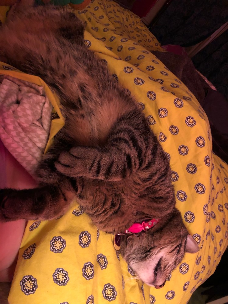 Nala pooped on me right away, and all I had on was a t-shirt and underpants. We went to make coffee, feed the cats, and I made her tea. She pooped on me again. Time for a clean t-shirt.