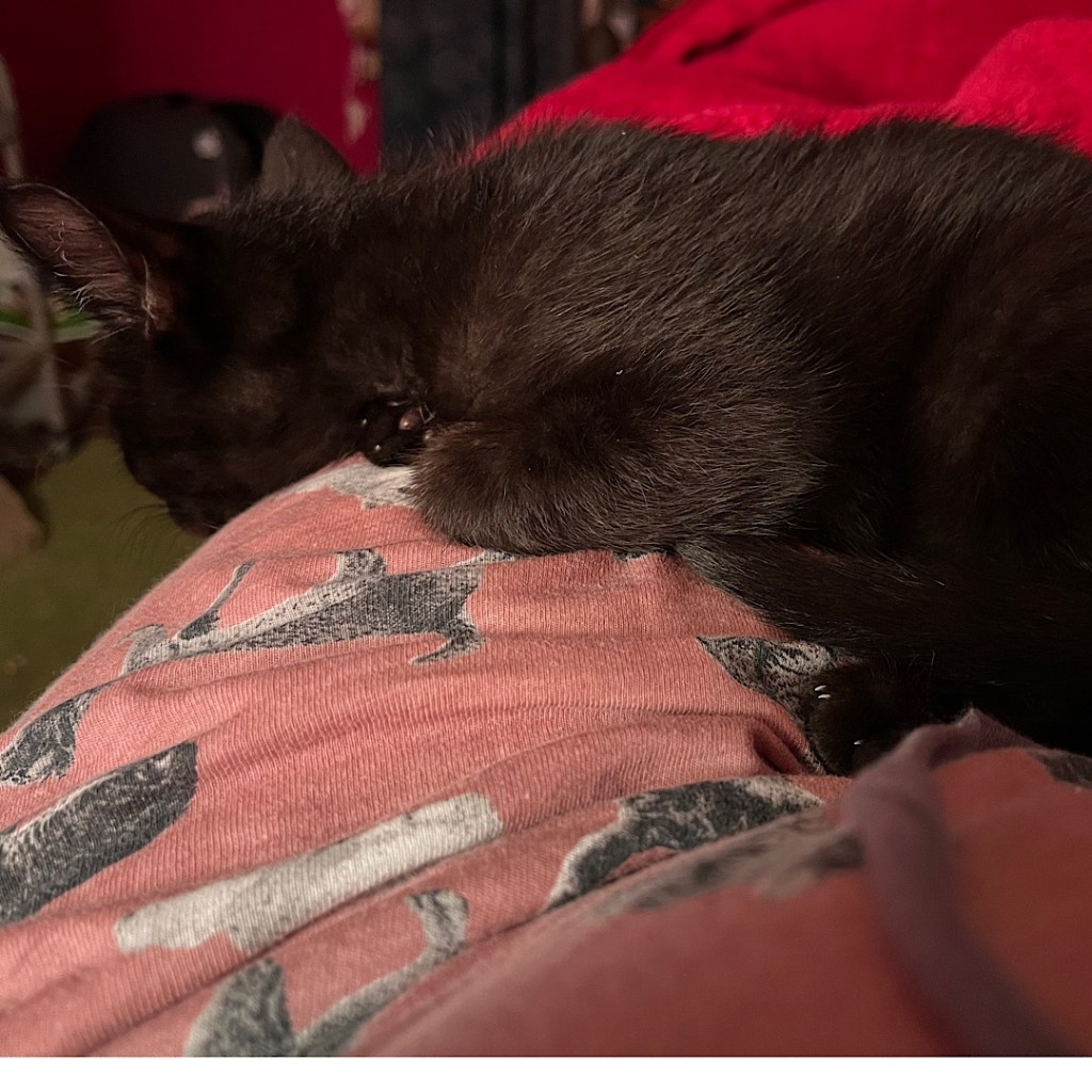 And then, she went home and I talked to my friend Maryann Ignatz. I did all the press stuff I had planned for my business. I thought I deserved a small rest. I went up to my room and cuddled with some fosters, including sweet Jean-Paul Sartre.