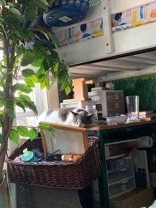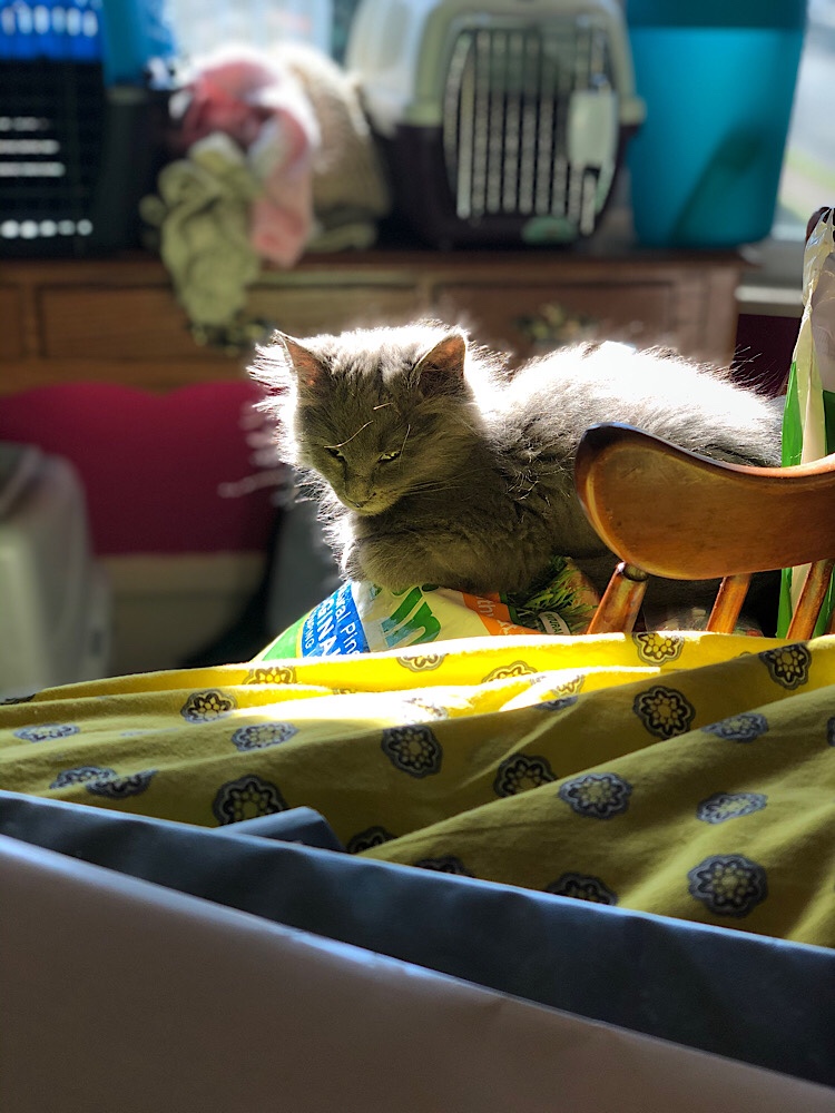 This morning I tossed FURR fosters Jean-Paul Sartre and the random litter (they were named before I got them and have no theme so my naming convention does not apply) onto the sun porch to meet each other and perhaps influence each other. JP needs more socialization with other cats and the Random Litter, as I have christened them, need to learn that they are safe. They should be able to look at JP and realize, “hey, nothing attacked this little moron.” I filmed some videos. They are rather long and boring, but, if you’re patient, you might notice JP stalking our old man tripod Opie and little Dixie/Jenny (her folder was blank so I named her Jennifer Grey so ‘no one could put Baby in the corner,’ and then I saw online that her foster file said her name was Dixie) considering trying the cat door or making friends with my boy Fog.