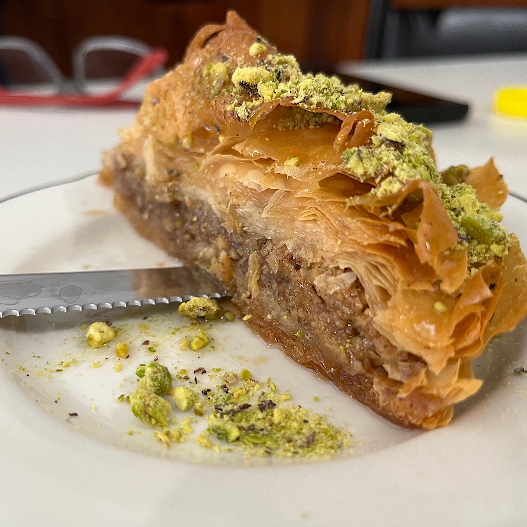 The man behind us explained to his date in detail how they make baklava which involved lots of repetition of “they crush pistachios” and “they layer phyllo dough and honey” over and over and over.