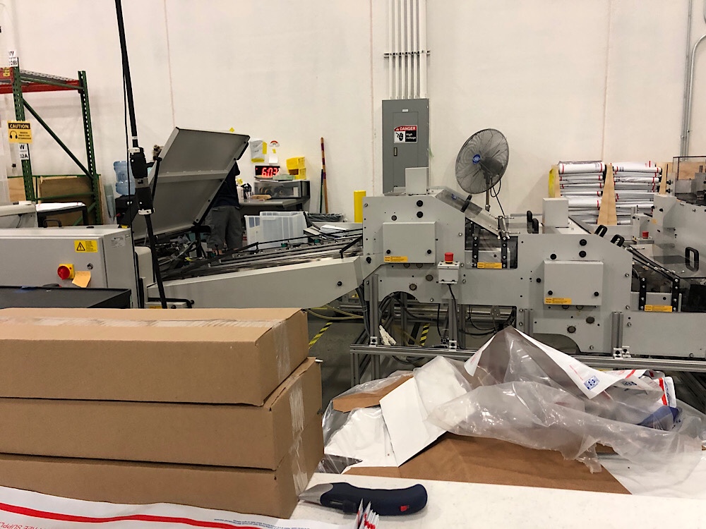 Basically we unpack the mailers, sort them so they are less likely to jam the machine, and feed/empty the machine. There is a zen to lining up the mailers on the rolling machine, fanning them and making sure they don’t curl.