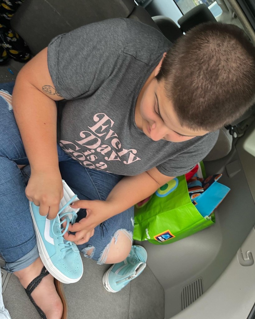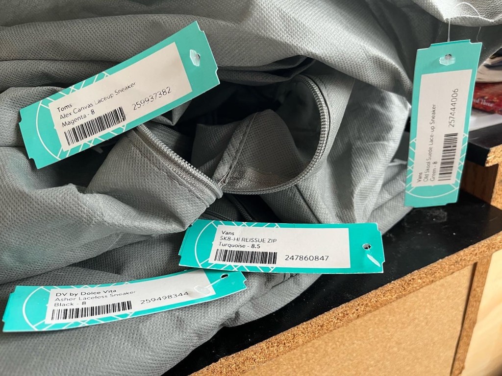We placed the shoes in the back of the teenager’s new car and she dove right in. Neither of us knew her sneakers had zippers and she didn’t recall the color so those were fun surprises.