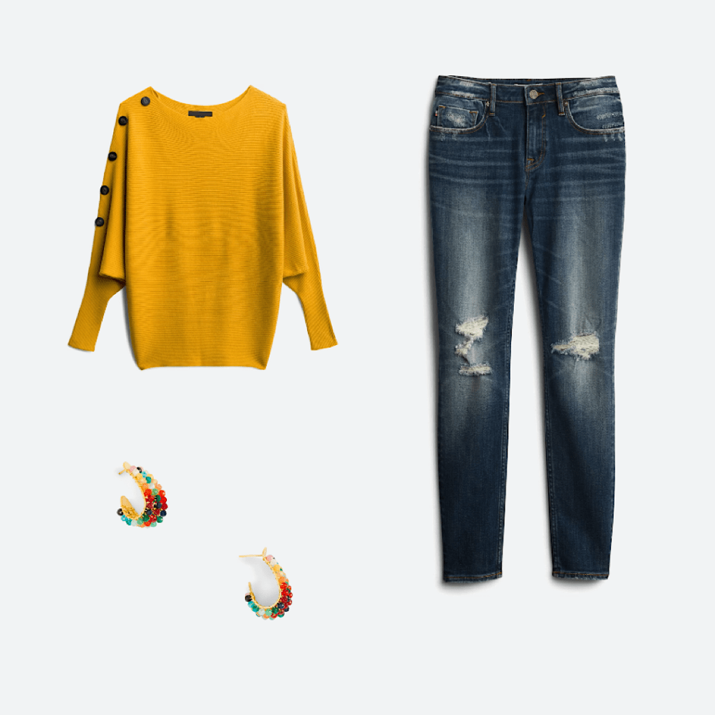 20. Casual dressed up? I love the soft feel of this sweater and the buttons but the color doesn’t excite me. I would have to see the jeans on to know for sure how I feel about them, but I’m starting to believe distressed jeans have to be straight, or skinny, in order to have any sort of feminine vibe other than “I’m destitute.”