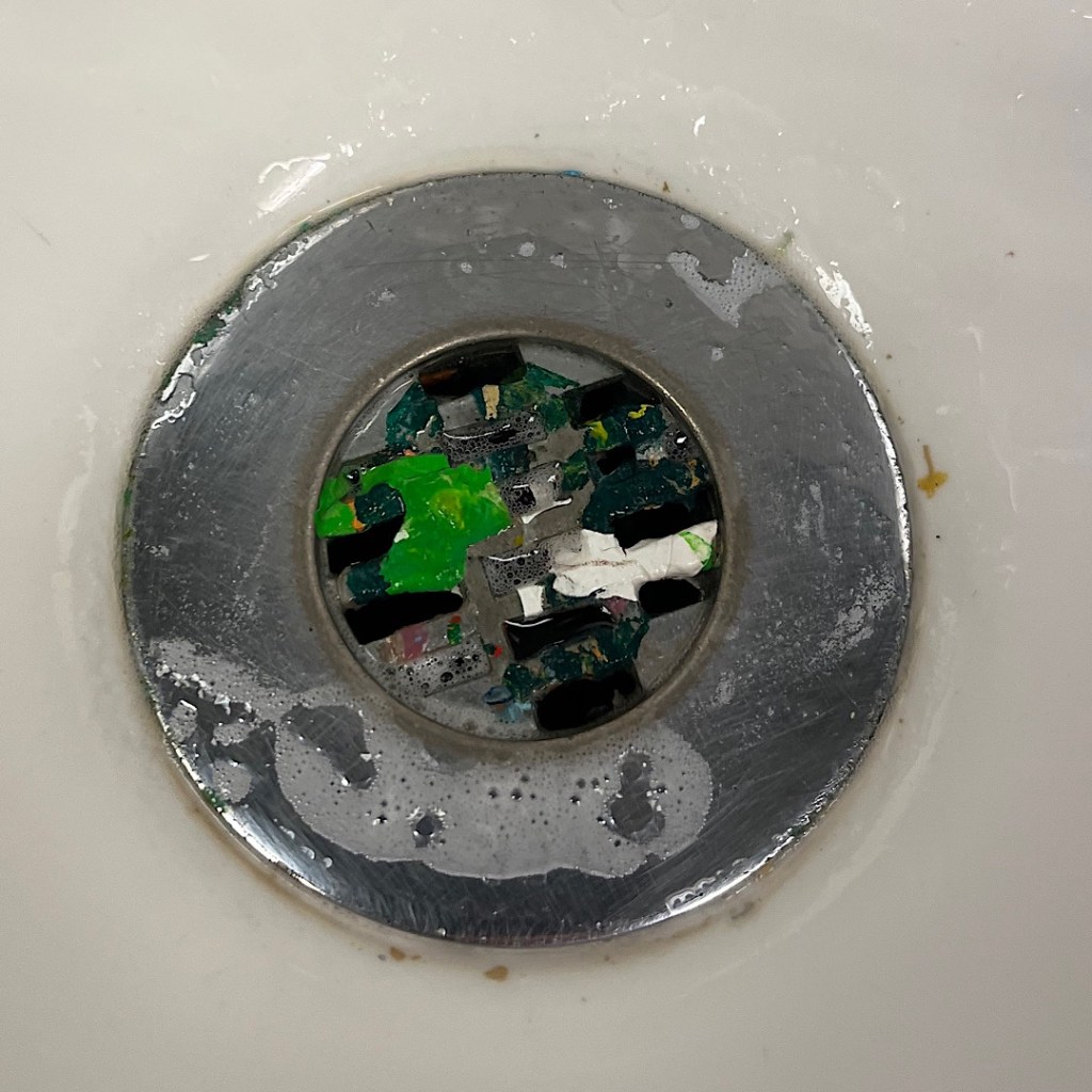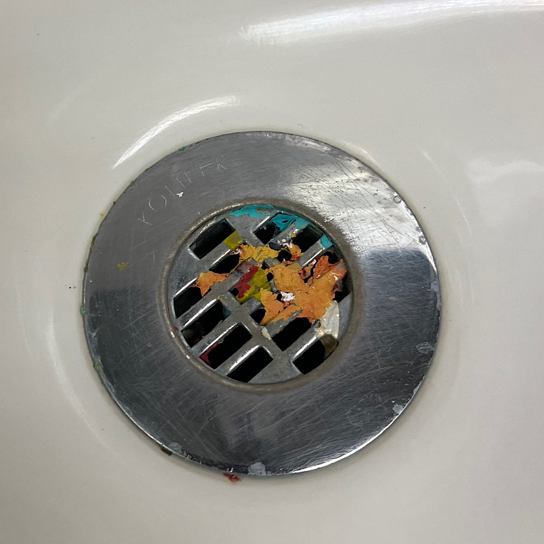 I had to stop in the bathroom, where I paused to take photos of the paint stains in the sink.